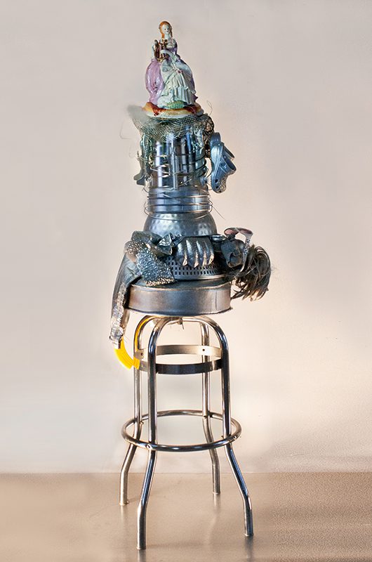 Found objects and Italian porcelain figurines on bar stool | Sculpture
