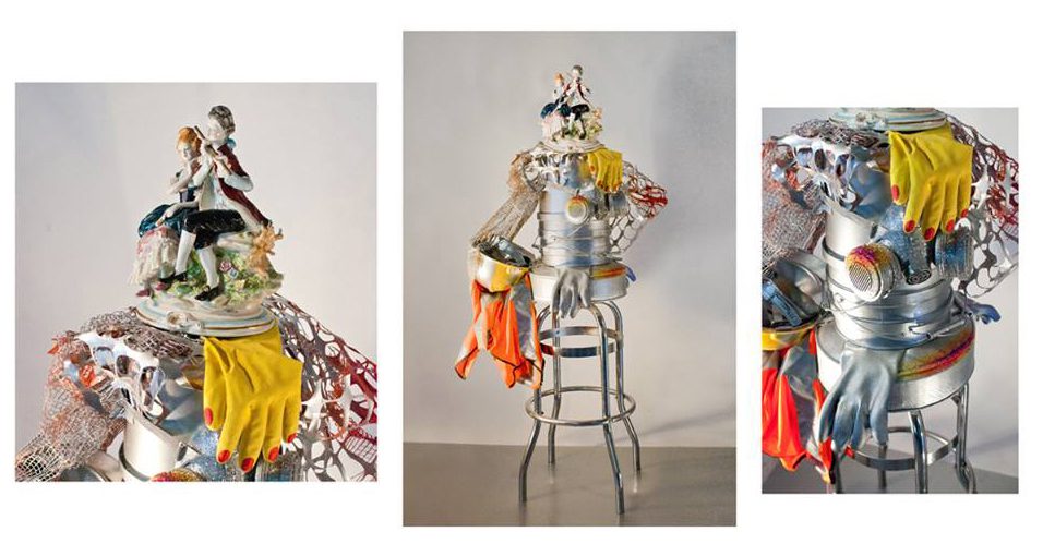 Found objects and Italian porcelain figurines on bar stool / Sculpture